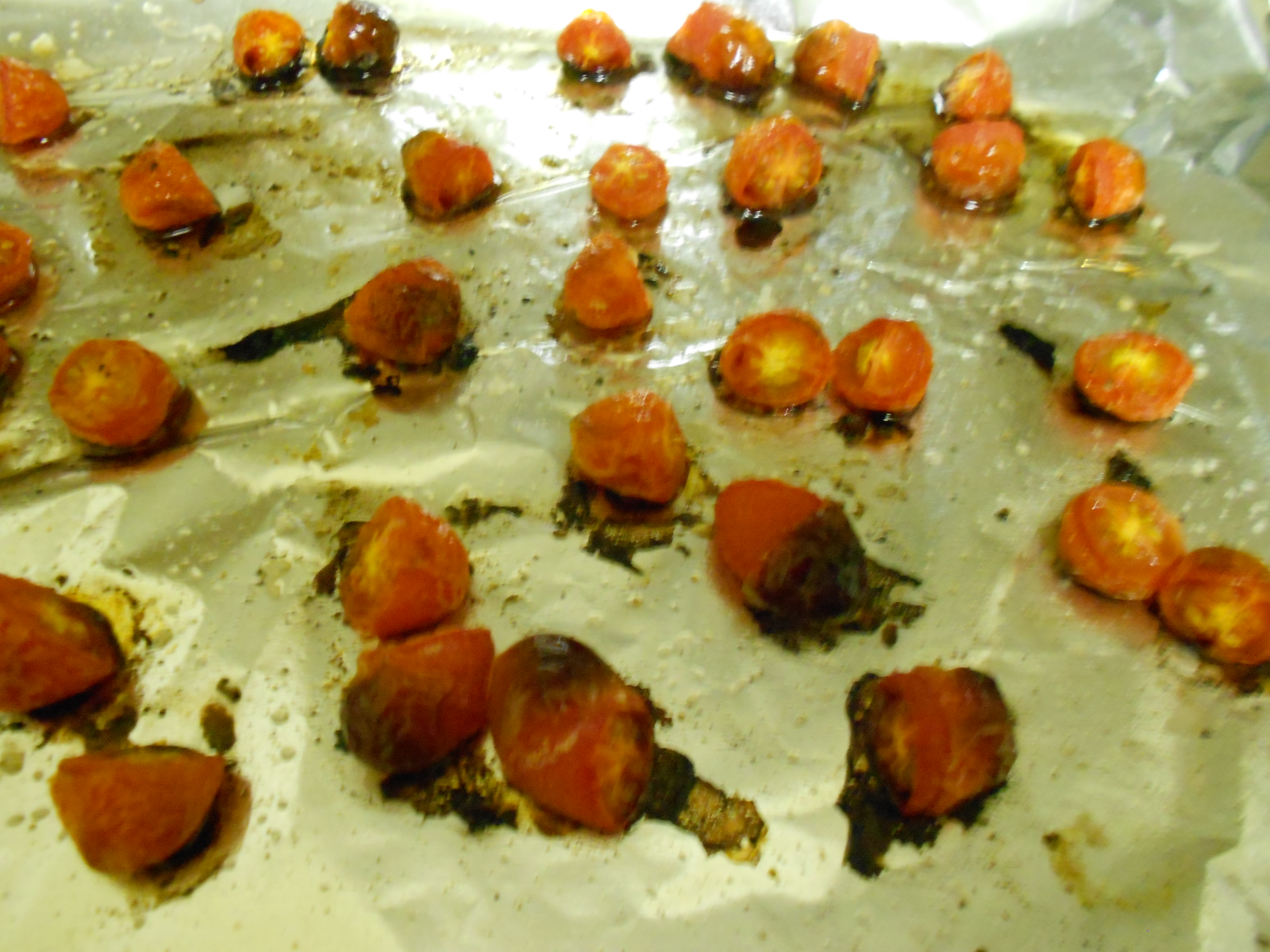 3. Sliced a handful of cherry tomatoes in half and spread them on another baking sheet with a drizzle of olive oil, plus salt and pepper. I put them in the oven about 15 minutes after the squash went in.