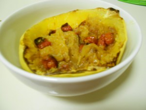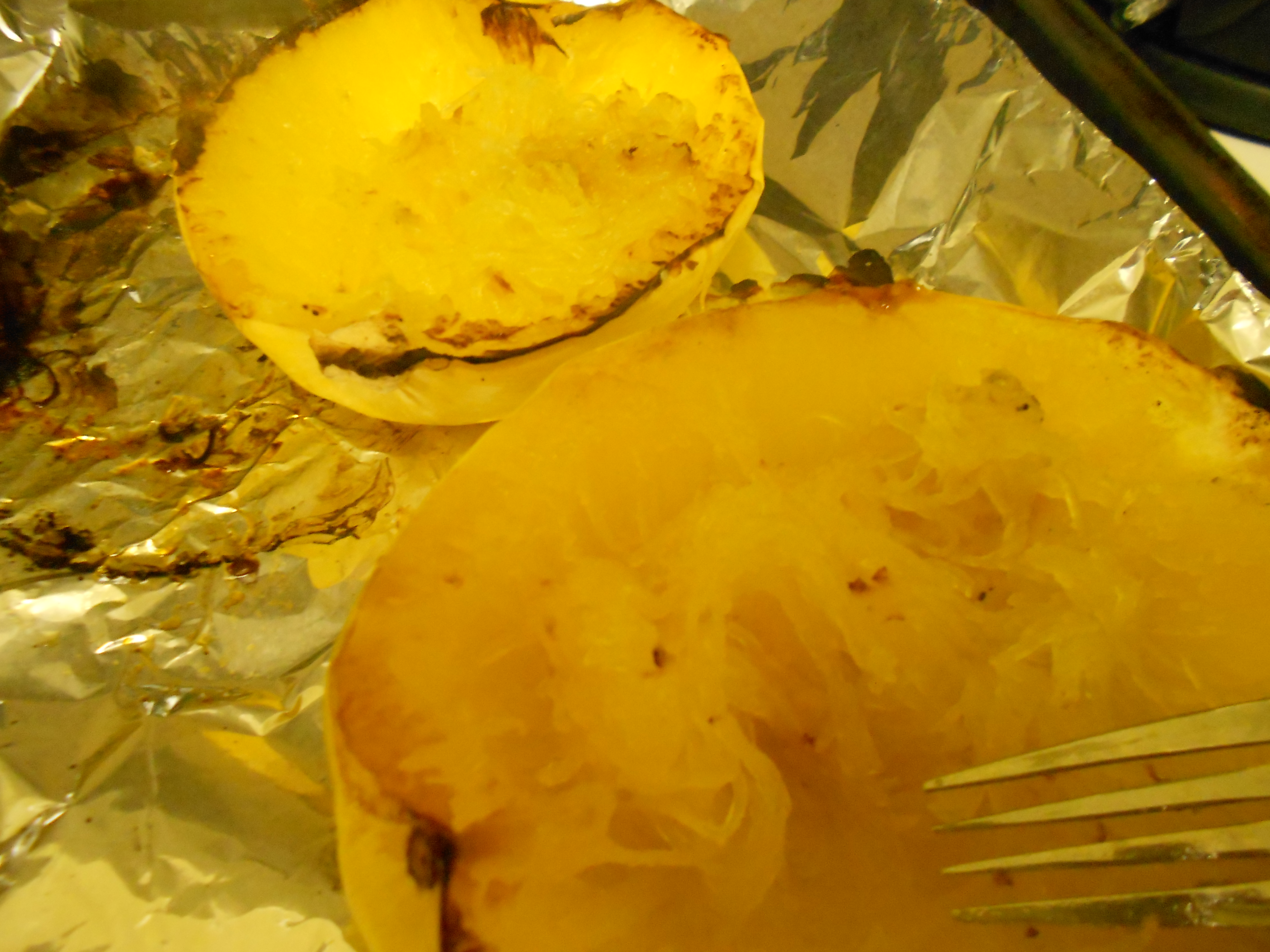 4. I removed the tomatoes and the squash from the oven. Then I flipped the squash over and used a fork to fluff up the “spaghetti” on the inside.