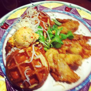 Benne Seed Fried Boneless Breast of Chicken Pieces & a Honey-Mustard Aioli Drizzle on White Cheddar-Green Onion Waffles with Peppadew-Jalapeno Butter