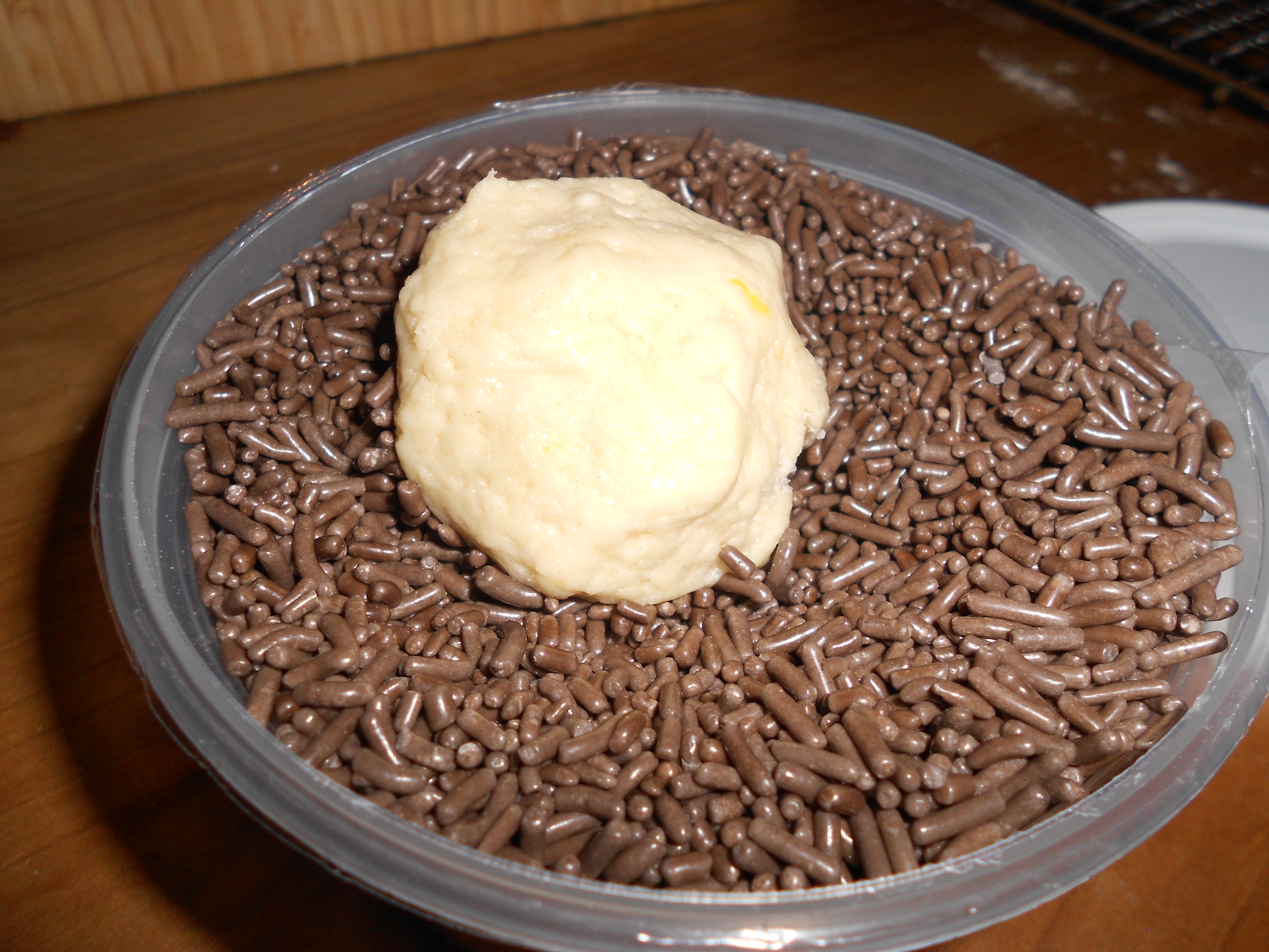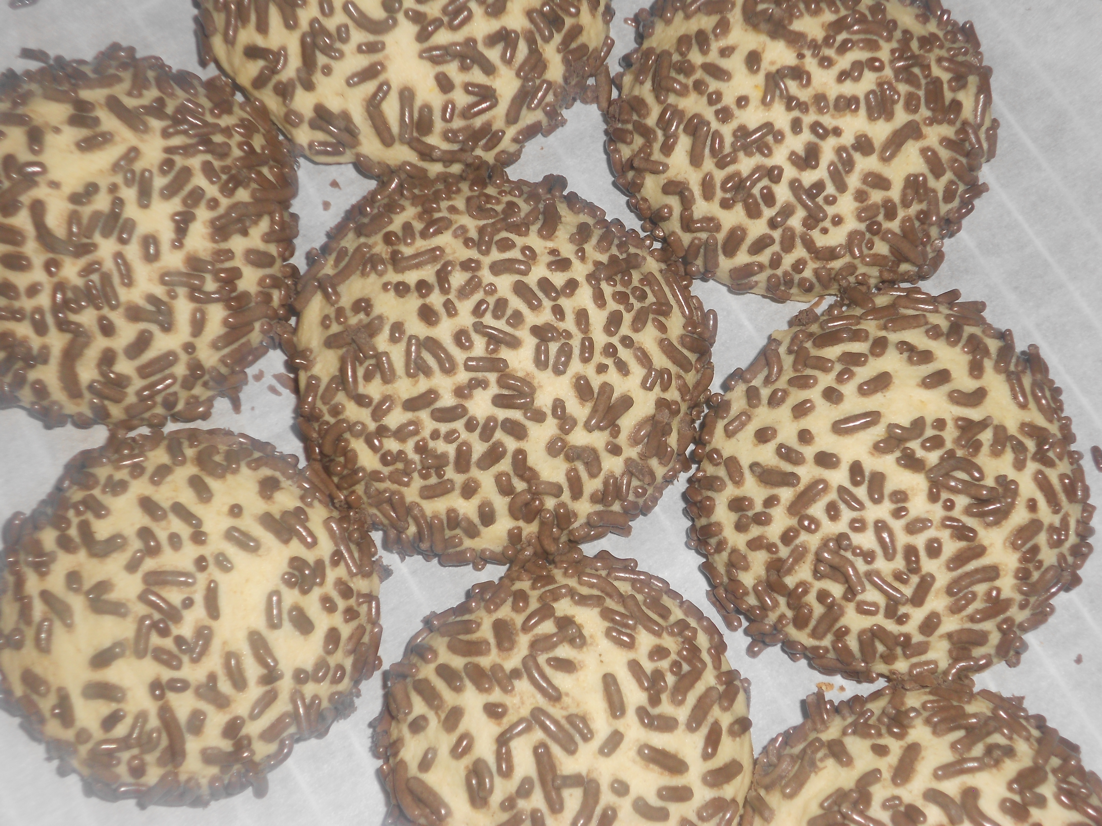 - Roll dough into tablespoon size balls. Flatten the dough slightly and dip one half of the ball in the sprinkles. Place the dough sprinkle side up on a parchment lined cookie sheet (you want the dough closer to discs rather than balls so the cookies come out somewhat flat). Most recipes call for the sprinkles to be added after baking with a glaze or frosting, but I prefer this method.