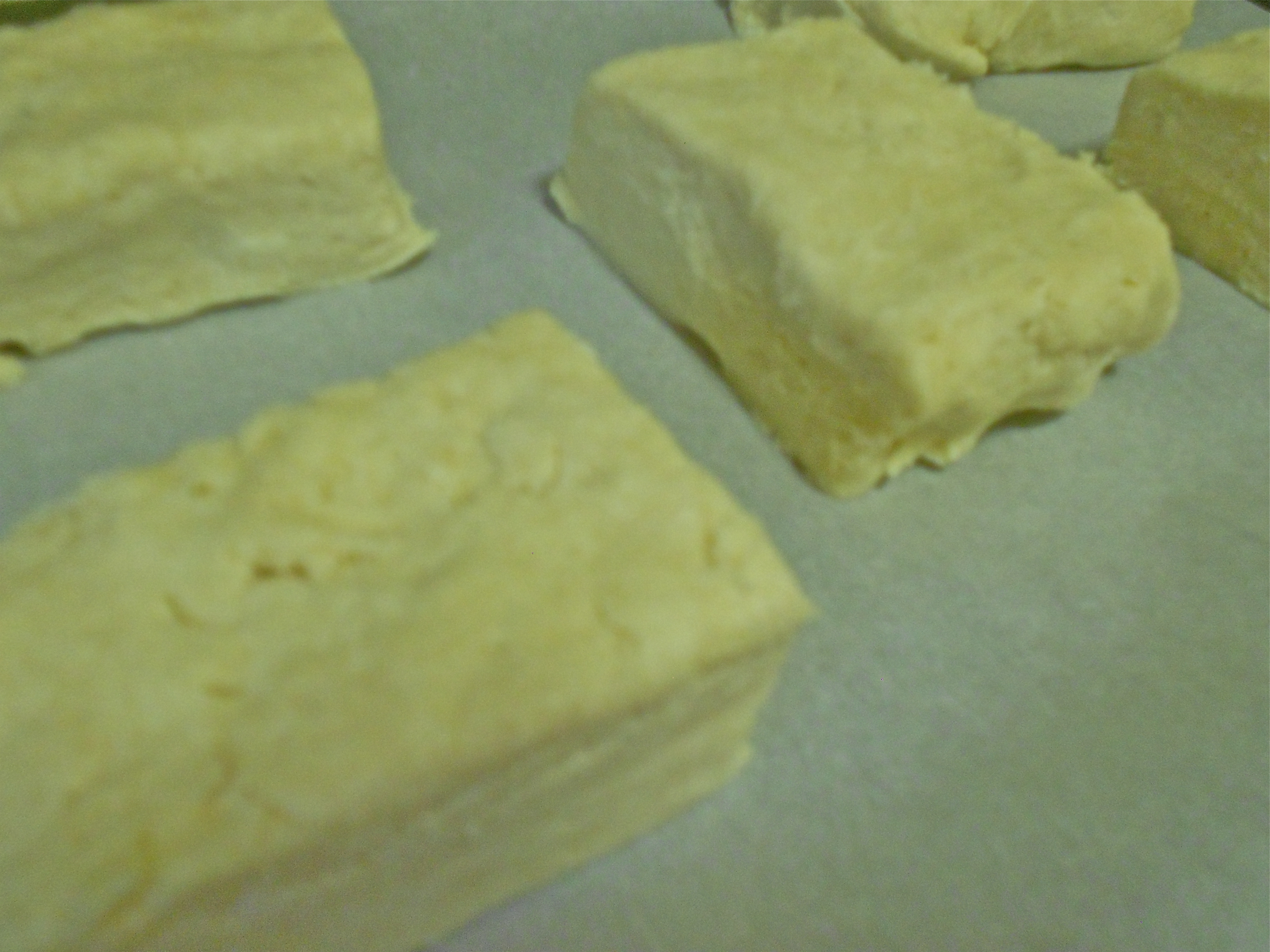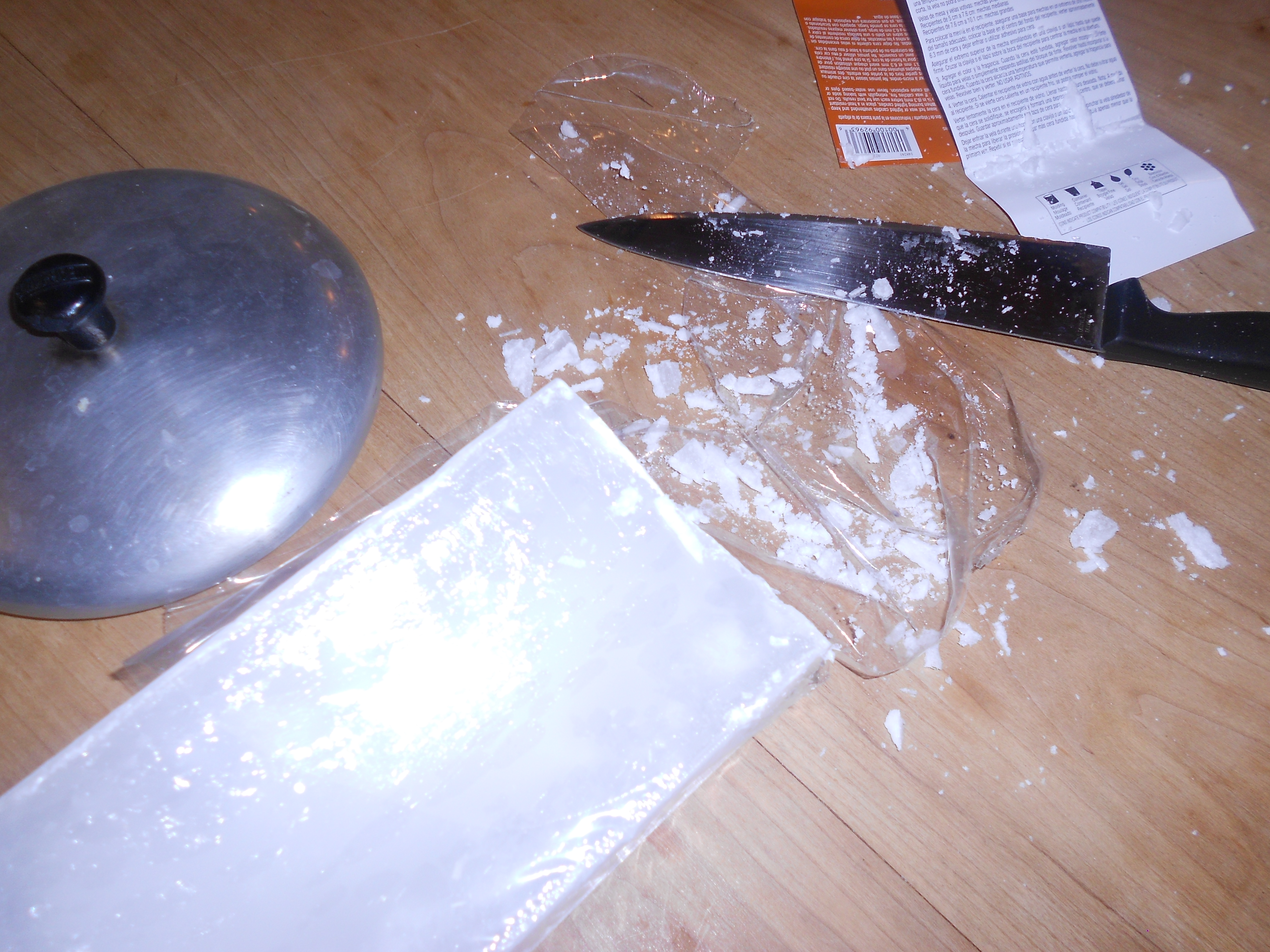 To get started I chopped up about half of the four pound block of wax and started heating up a little water on the stove in the bottom of a double boiler. I dropped the chopped up wax into the top of the double boiler and watched it melt down.