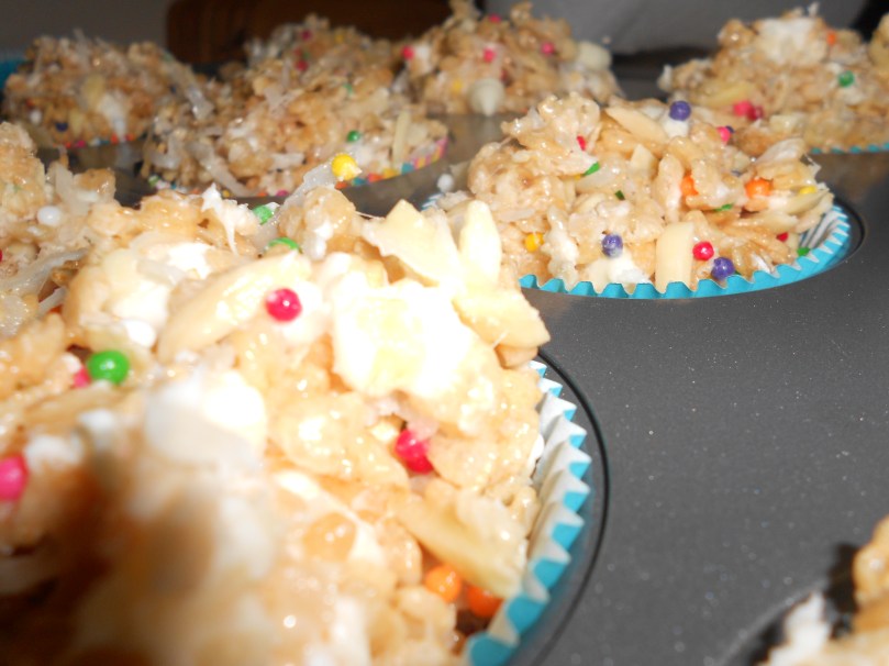 This has become my go-to option when I need a quick and tasty treat to share with a group. Rice Krispie treats are always a crowd pleaser. It’s a little disheartening because they’re so easy to make and yet so delicious. To amp them up a little I try to mix in some interesting ingredients. Just so it looks like I put some effort into the situation. This time I went with coconut, almonds, and white chocolate chips. A winning combination.