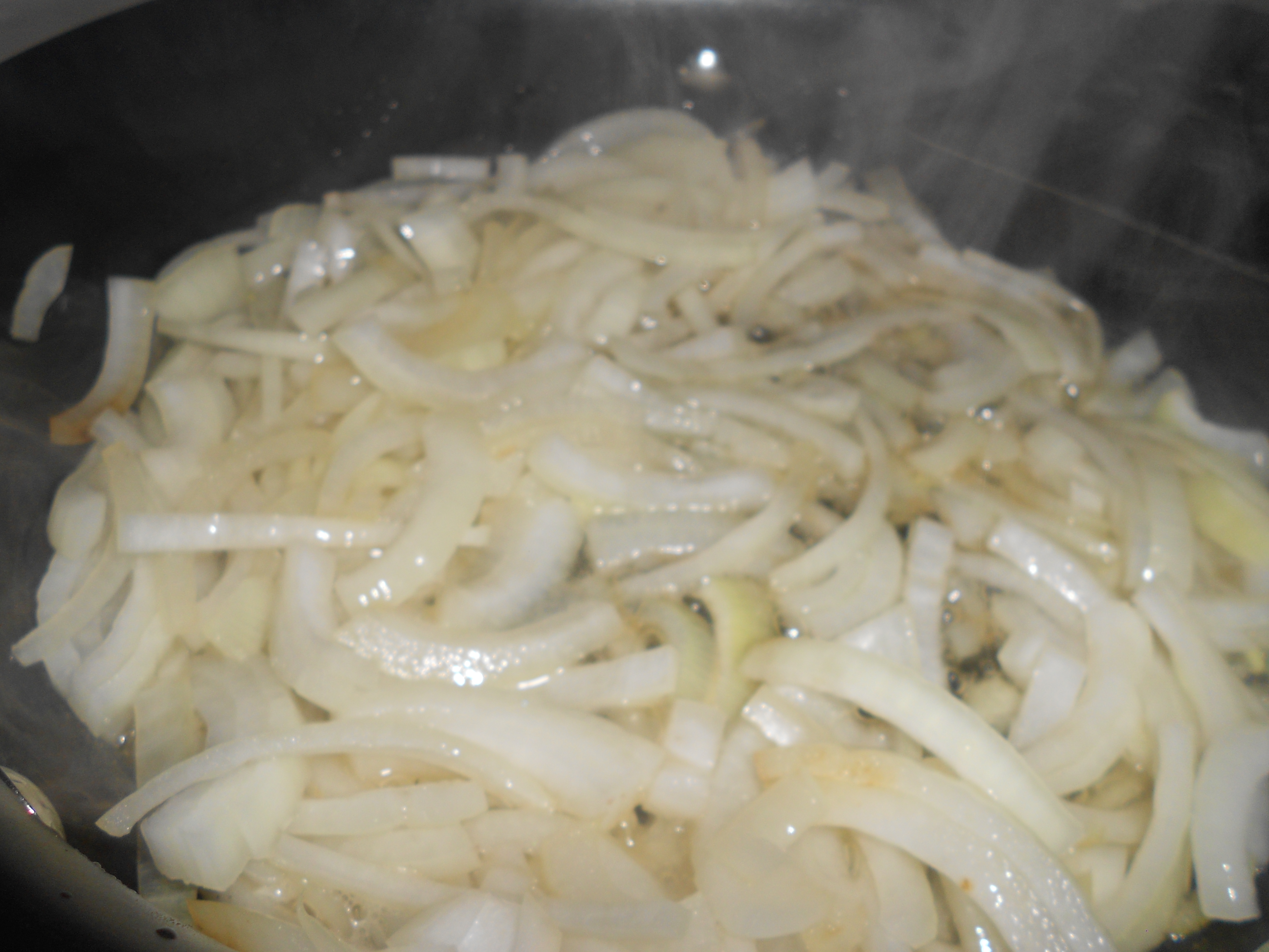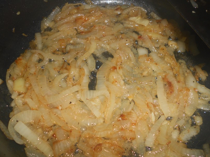1. Heat a medium sized frying pan on low heat.  Melt butter in pan.  Add sliced onion, then minced garlic.  Allow to cook on low heat until the onion caramelizes and turns a nice brown color.  About 30-45 minutes.