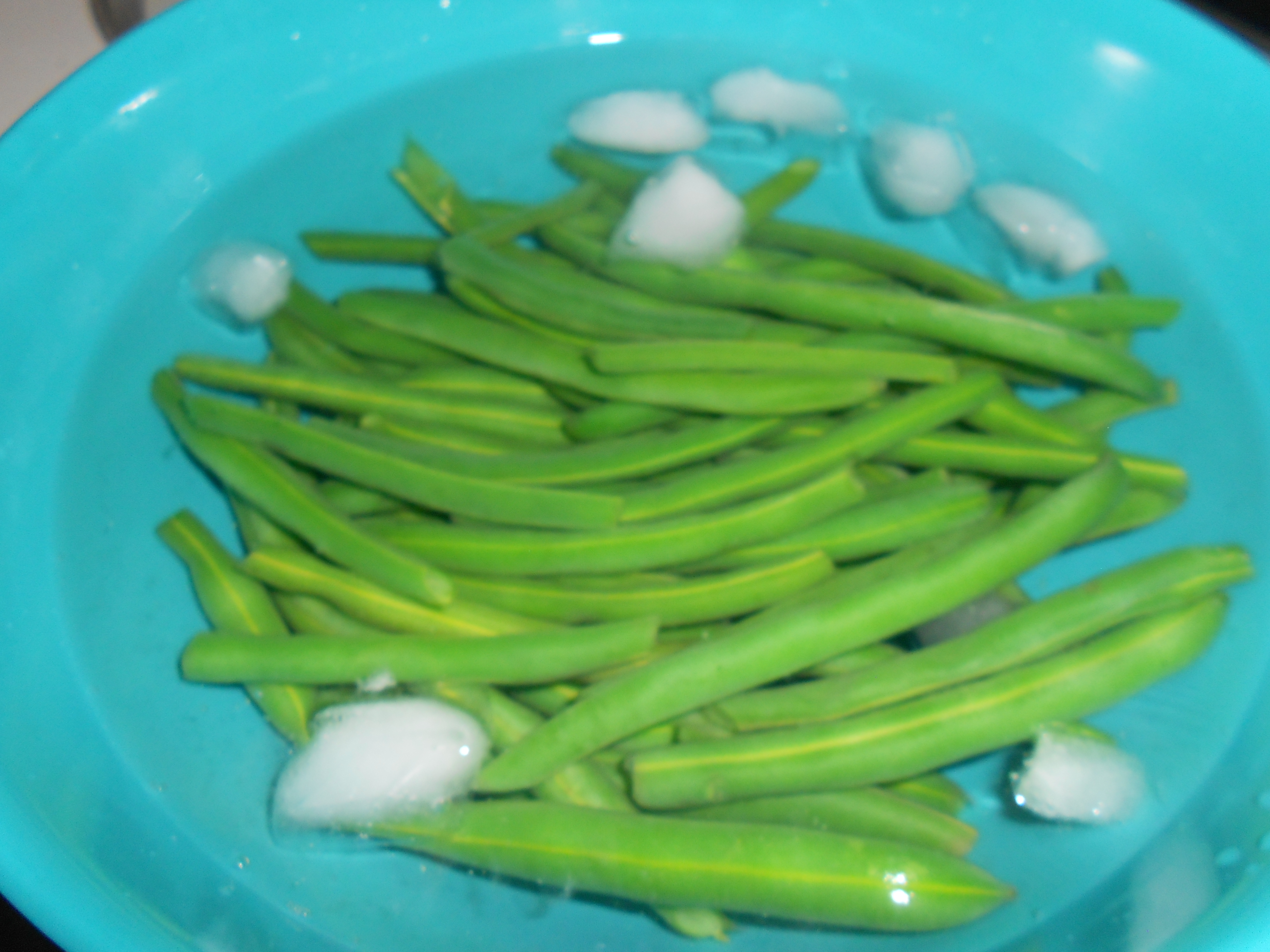 2. When the onions are close to done, blanch the green beans.  This is done by adding them to boiling water, allow to cook for 4-5 minutes, then transfer beans to an ice bath (bowl with ice water and room for the beans).  The transfer to the ice water will stop the cooking process and leave the beans crunchy.