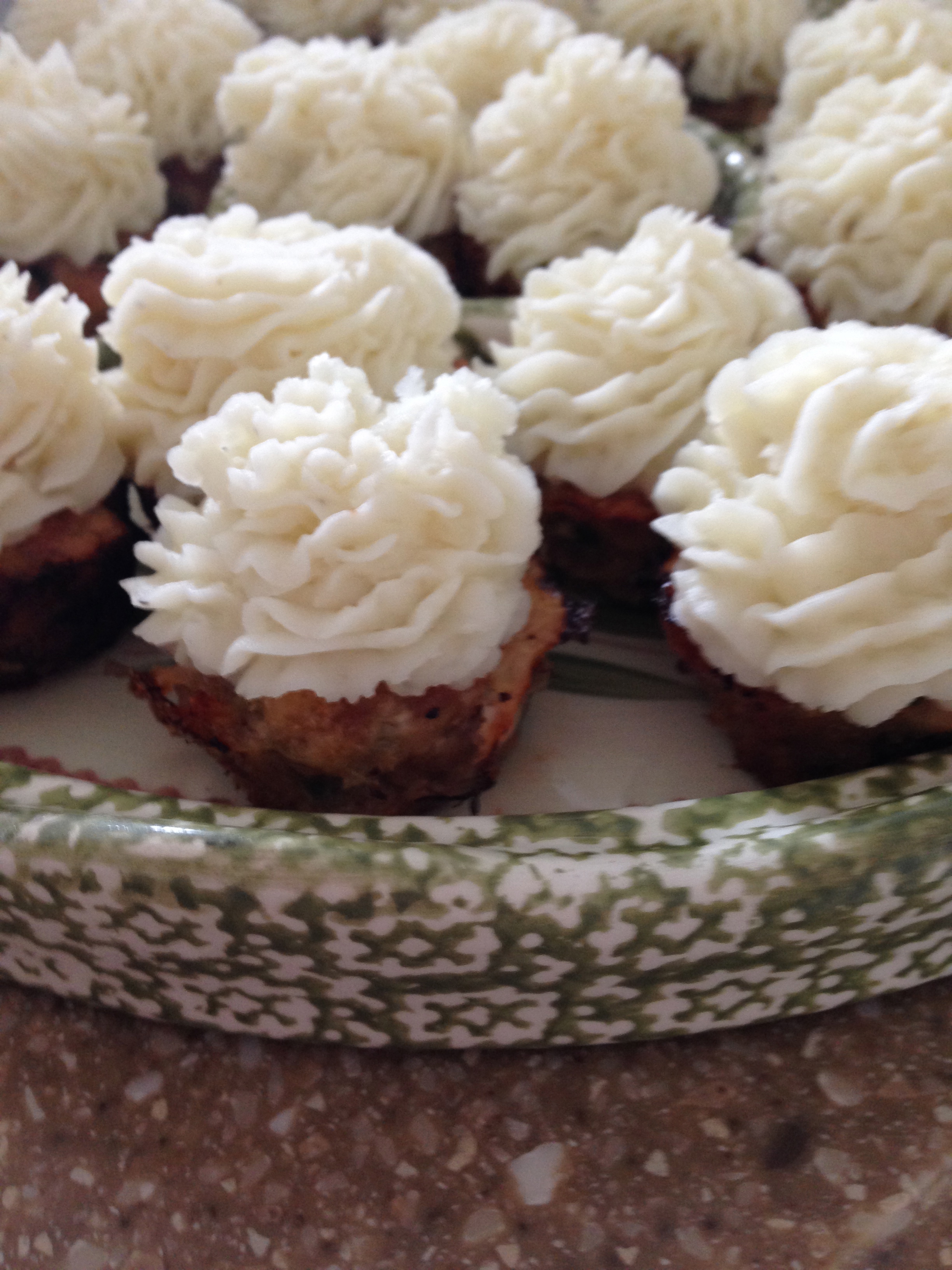 Bake until the meatloaf muffins are browned. Then make your favorite mashed potatoes and pipe them on top of the meatloaf muffins using a pastry bag and a star tip.