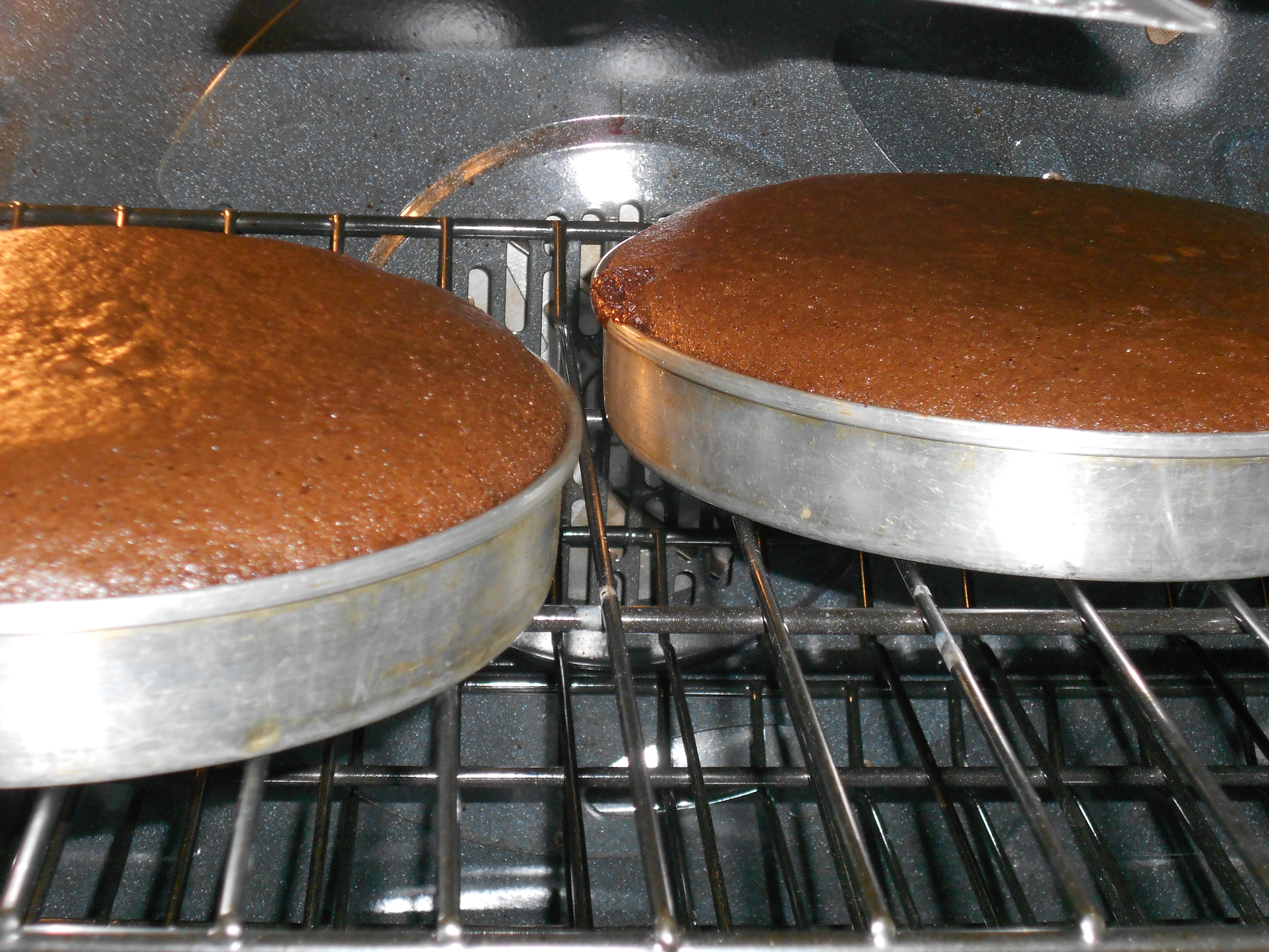- Preheat oven to 350. Prepare pans by spraying with non-stick spray and coating with cocoa powder. If you want to be extra cautious, cut out a circle of parchment paper to fit in the bottom of your cake pans.