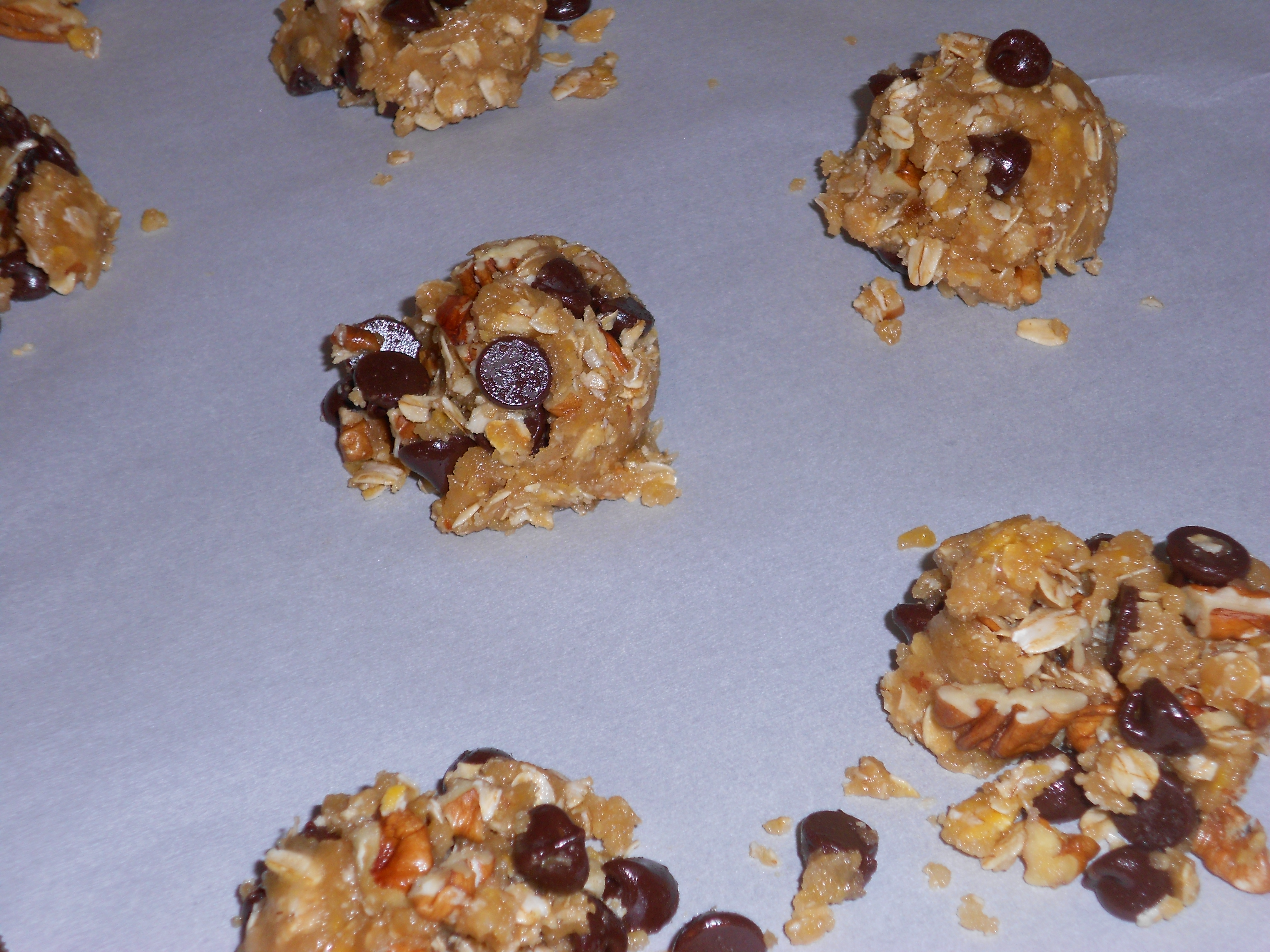 3. Use a spoon or ice cream scoop to portion batter onto a parchment lined cookie sheet. As you portion out approximately 1.5 inch balls or mounds, the dough might not stick together very will, but it should all be resolved in the oven.