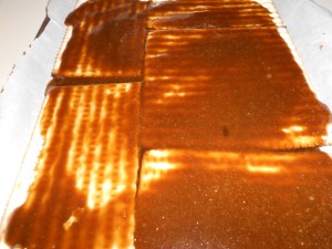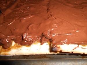 - Pour hot toffee evenly over the matzo. Bake in oven about 20 minutes. It should bubble and get deep brown, but do not let it burn.