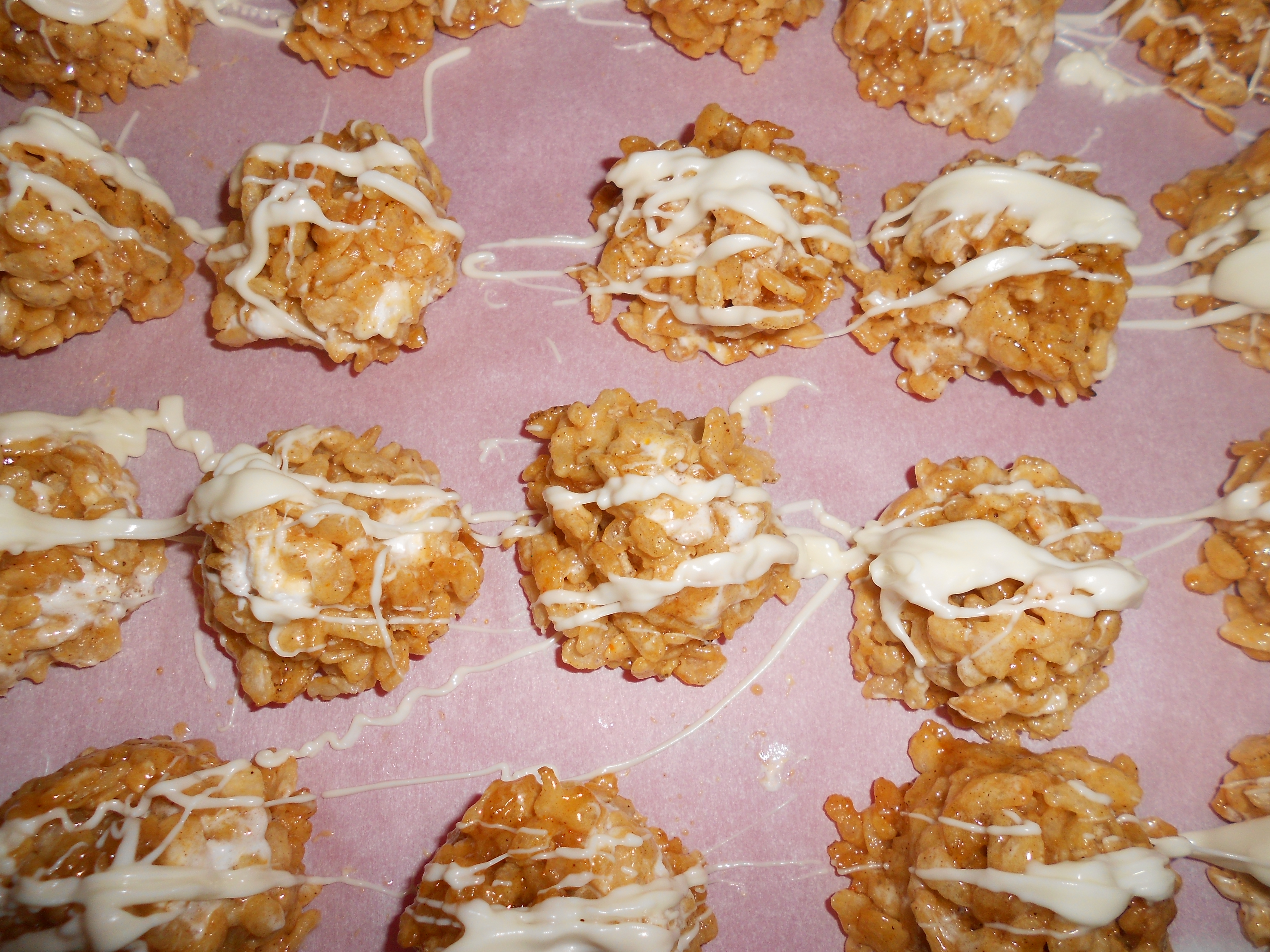 4. Once treats have cooled, melt the white chocolate chips in microwave for 30 second intervals. Make sure you don’t burn it! Use a fork to drizzle it over the treats for a little extra je ne sais quoi!